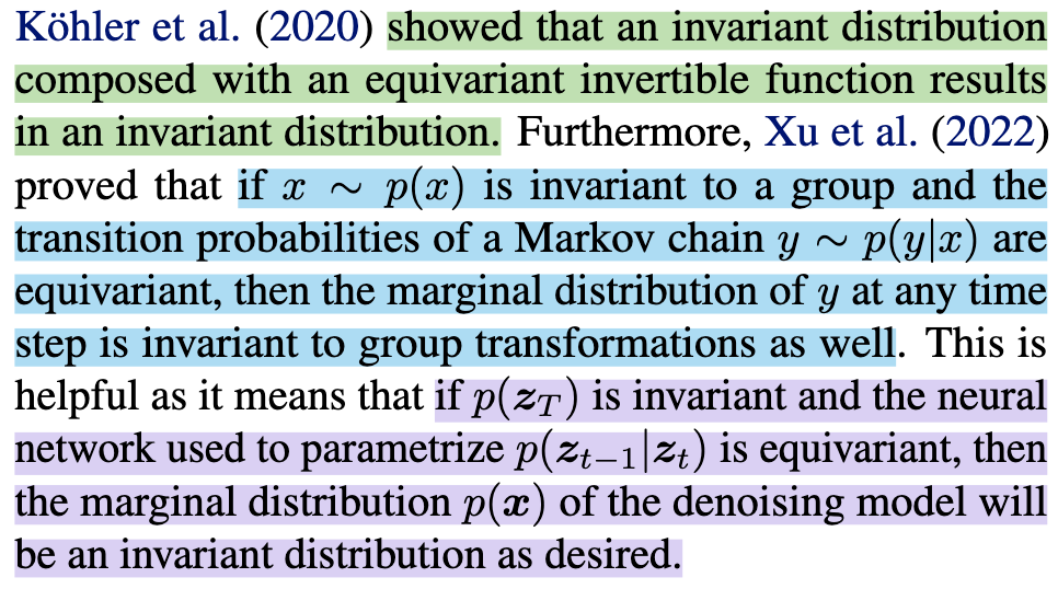3. 应用到Diffusion:Diffusion起点的纯噪声\(p(z_T)\)是高斯分布,是一个不变分布,反向去噪的过程如果使用等变的神经网络,那么转移概率也是等变的,最终得到的分子分布也就是等变的。