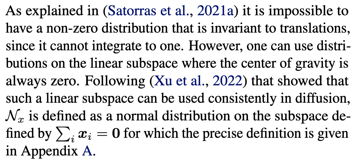 他提到我们的分子生成并非是可以在空间中随意移动的,因为如果想要保证平移不变,我们需要将概率分布在无限大的空间中平铺,这显然是不可能的。